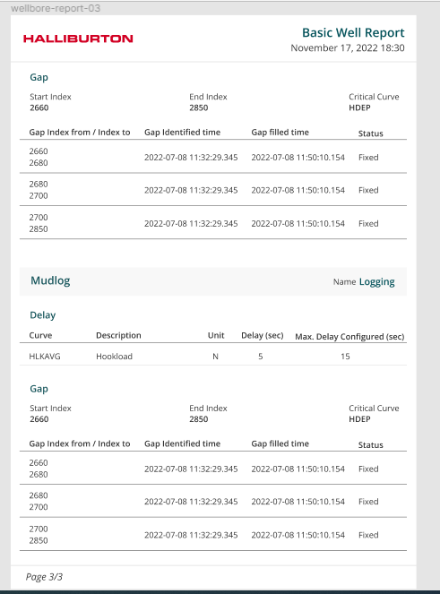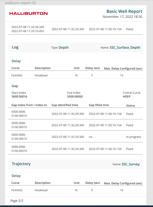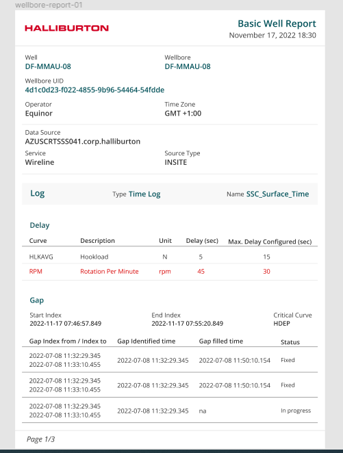 The downloaded report will be titled Well\Wellbore name. The pdf report will include all of the information available in the wellbore. Please refer to the figure below