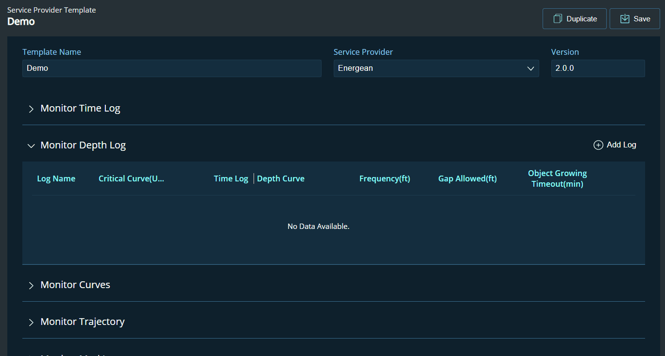 This page allows the user to choose a template from the template list, or the user can create a new monitoring template for each operator. Configuration for Logs, Trajectory, Mud log, and curves will be included in the template.